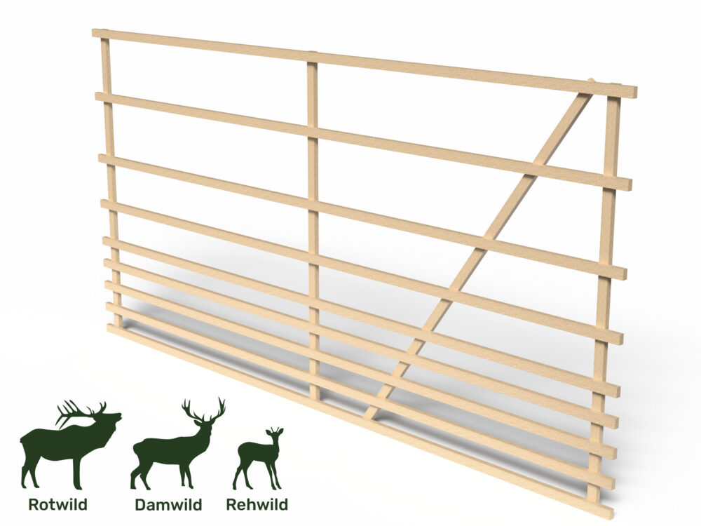 Die besonders dichte Lattung im unteren Bereich verhindert zuverlässig das Durchschlüpfen von Rehwild und schützt junge Triebe und Kulturen vor dem sogenannten Verbeißen der Äsung. Mit 3 senkrechten Latten und einer Diagonalverstrebung bleibt das Element trotz hoher Stabilität modular und handlich.